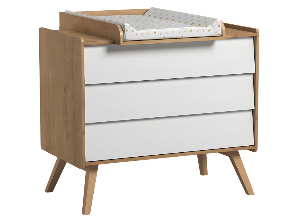 This complete baby bedroom set includes a baby bed, a three-drawer dresser, and a two-door wardrobe, all finished in a natural light tone with a vintage wood effect. Designed to stand on the floor, the collection provides practical storage and a cohesive look for a modern nursery. Constructed from particle board, the pieces balance durability with a lightweight, easy-to-move profile. The set accommodates a single occupant and is suitable for compact spaces while offering versatile storage options.